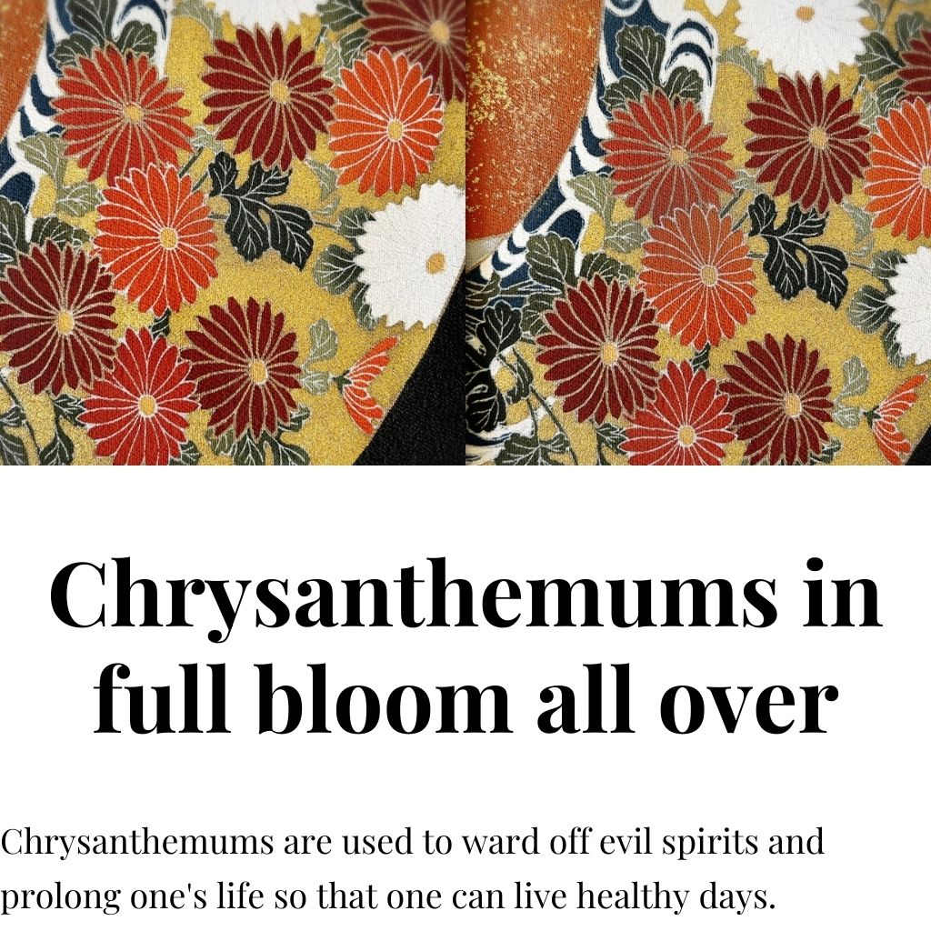 Chrysanthemums have various meanings such as "noble," "lofty," "prolongation of life," "exorcism of evil spirits," and "stability of mind and body. Since ancient times, it has been said to be a pattern of good luck and invites good fortune. The various colors of blooming chrysanthemums heal those who see them.