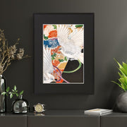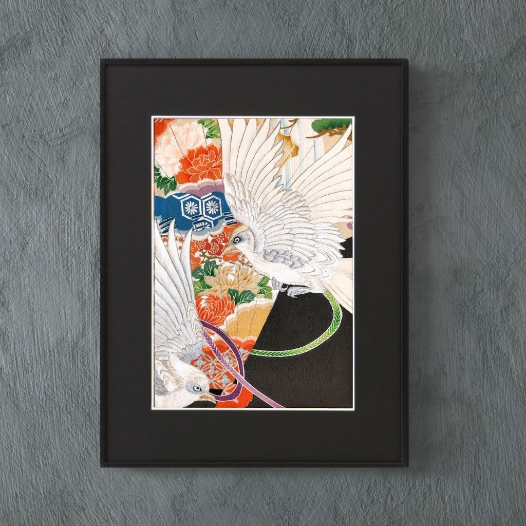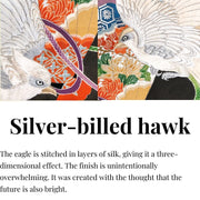 Two eagles are flying around inside a fan with chrysanthemums and peonies painted on it. They are stitched three-dimensionally with gold and silver threads, showing the skillful technique of our craftsmen. It is a symbol of good luck and high quality.