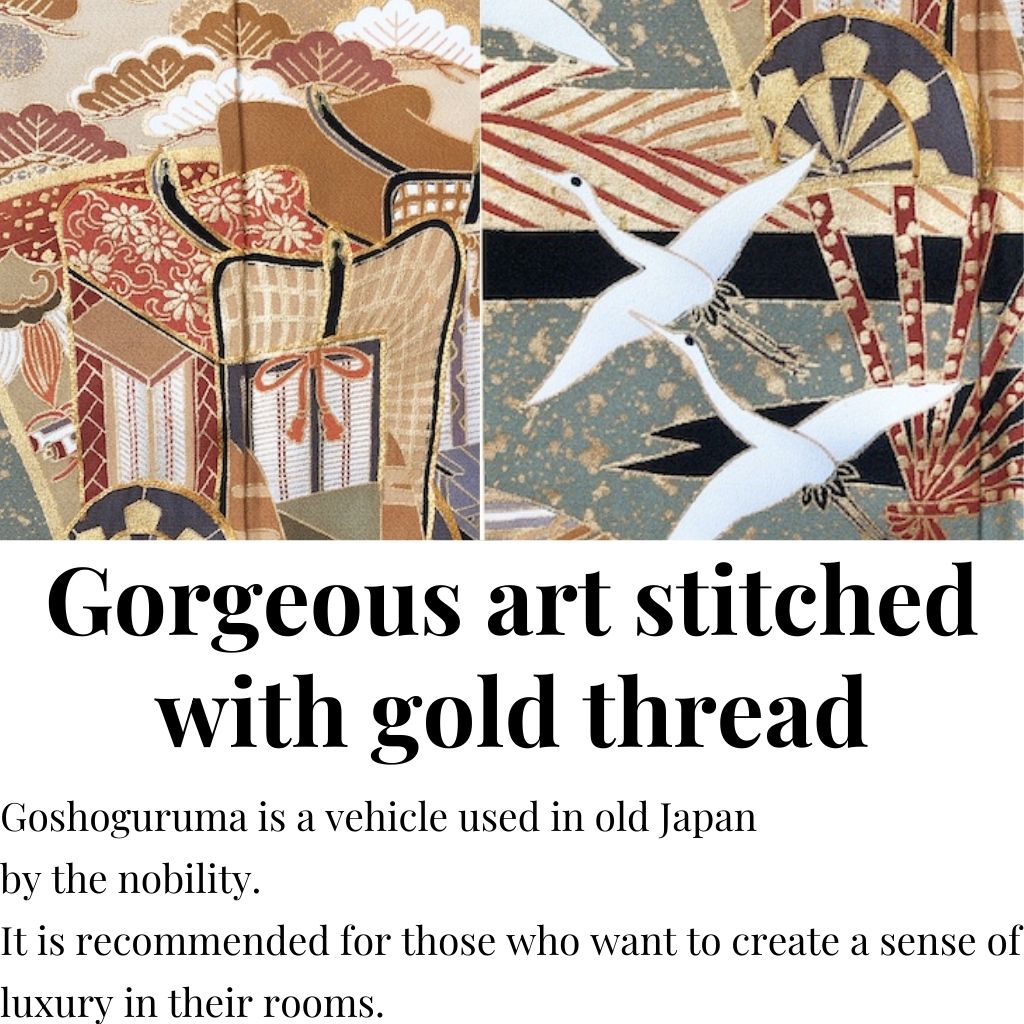 "GOSYO-KURUMA" refers to vehicles used by the imperial family and aristocrats around the imperial palace during the Heian period in Japan. The luxurious and gorgeous decoration is meant to increase money and ward off evil spirits, and gives a sense of luxury to the room.