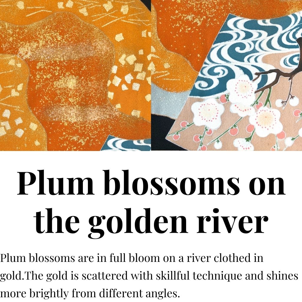 Plum blossoms are blooming on the golden shining river, which is sprinkled with gold.